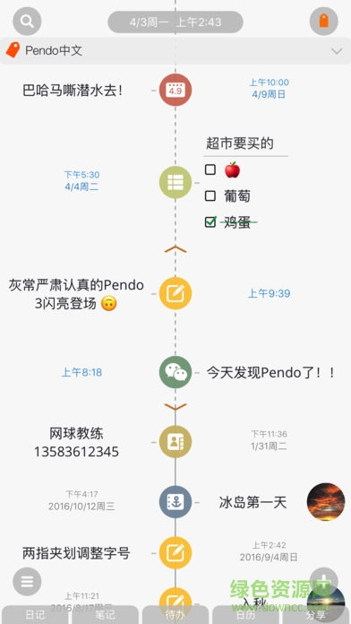 Pendo是一款写笔记、记待办、计划日程以及社交分享应用。与常见的清单、笔记应用不同的是,pendo笔记app将“日记、笔记、待办、日历”整合到 Timeline (时间流)上,这样的模式适合更多人的思维模式,方便随时查看进度。同时需要在什么时间点做什么事情可以一目了然,能大大提高效率。