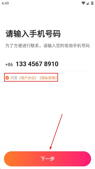3、勾选同意用户协议和隐私政策的选项,点击页面底部的下一步按钮。
