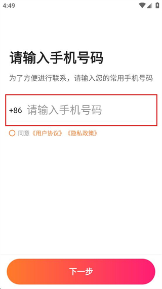 2、进入请输入手机号码页面,在对应输入框填写常用的手机号码。