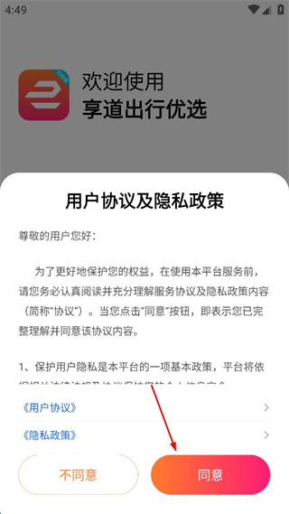 1、打开享道出行优选软件,出现用户协议及隐私政策弹窗,点击同意按钮。