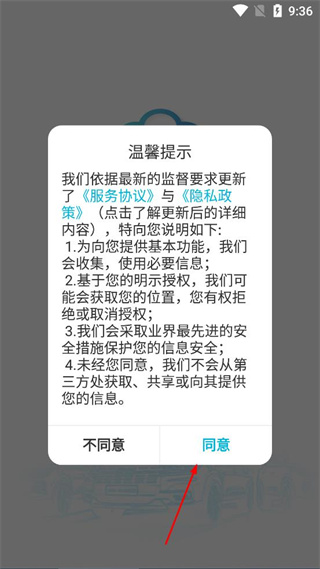 1、打开智云互联行车系统,查看弹出的温馨提示内容,点击提示框中的同意按钮。