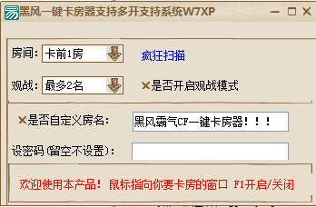 黑风一键卡房器是为穿越火线玩家打造的cf卡房软件,支持多开,支持win7/xp系统,可以自定义房间名和设置密码,玩CF想要宣传卡枪等广告的最好工具,推广宣传必备。喜欢玩CF的朋友可以免费下载试用,软件使用可以试用3次,赶紧来体验吧。