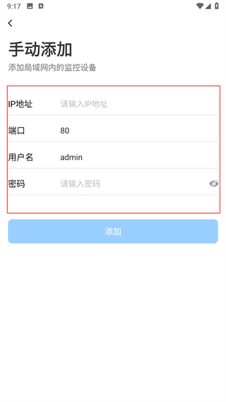 5、在手动添加页面,依次填写设备的信息,填写完成后点击添加按钮。