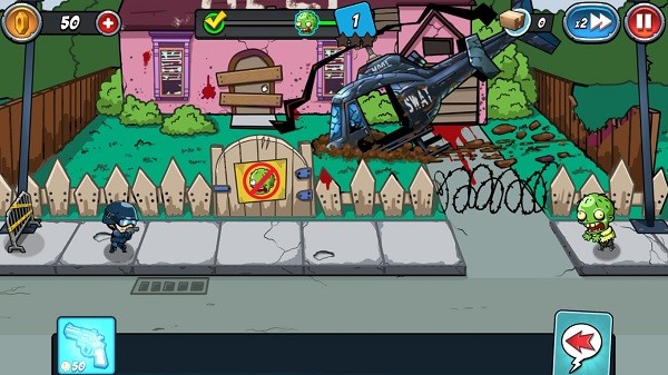 警察大战僵尸2游戏类似于植物大战僵尸的横版塔防游戏,这次的主角是警察和僵尸,在装备轮盘中你可以收集不同的枪支装备,通过布局阵容来抵僵尸进攻,玩法依旧趣味十足,游戏以汉化,感兴趣的玩家可以来下载体验更多。