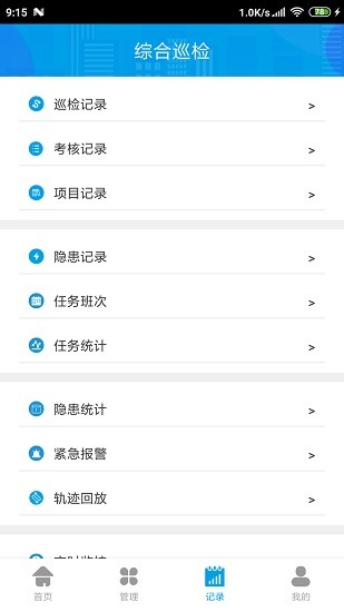 可以在记录模块查看巡检记录、考核记录、项目记录、隐患记录、任务班次、任务统计、隐患统计、紧急报警、轨迹回放和人员监控。