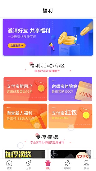 在福利中,新用户进入到平台就能领取到购物优惠,还有专属商品;