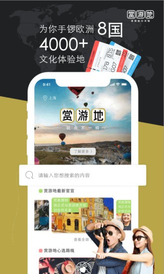 通过赏游app平台你可以探索欧洲本地特色的景点,不同于常见的景点,赏游更注重于给你一个像“当地人”一样的旅行体验,让你可以可以活动更多的像生活在当地一样的生活体验!在我们的app中有当地特色的博物馆、文化体验中心、特色活动!目前赏游app平台平台有7大欧洲城市,200+地区,超过300家特色博物馆、店铺、文化体验中心等。