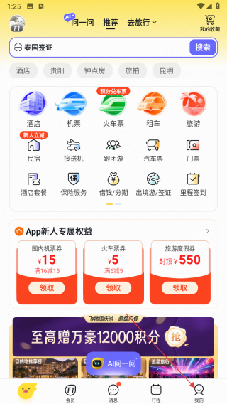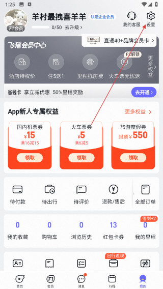 1、打开飞猪旅行APP,点击底部导航栏我的,进入个人页面。
