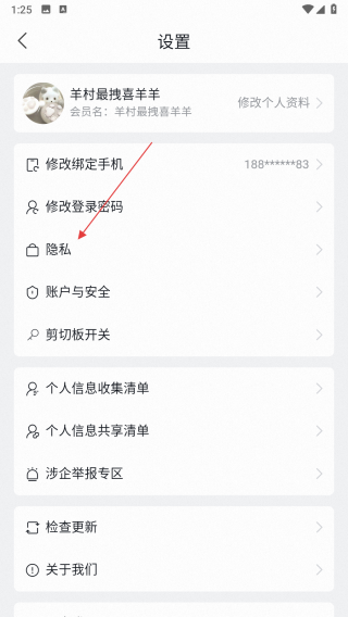 3、在设置界面中,点击隐私选项,进入隐私设置页面。