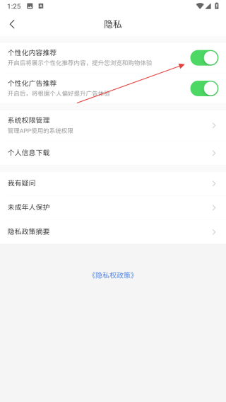 4、在隐私设置页面,找到个性化内容推荐选项,点击其右侧的开关按钮,将其关闭。