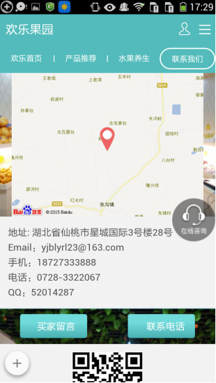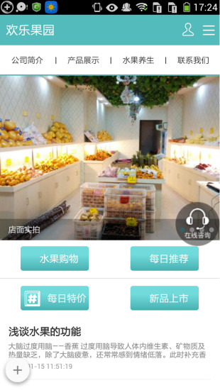 欢乐果园创建于2014年, 坐落于江汉平原,有着体操之乡,鱼米之乡的仙桃市,店面占地面积50平。建有市内一流标准化、现代化水果配送工服务。门面装修朝气蓬勃,交通便利,体现了其深厚的文化底蕴,和谐的工作氛围,人性化的经营理念,吸引着一批忠实客户。本店是以出售各类水果为主,新颖独特的营销理念,优雅别致的装修风格,其技独特理念无不处于国内领先水平,深受广大消费者青睐。科学、先进、完善的配送体系。“欢乐果园”水果店被誉为仙桃市“消费者信得过企业”。 先进的营销理念,使产品具有极高的消费体验。完善的进货渠道,造就了一批金牌水果,四星级的服务,让您购的满意,吃的放心。欢迎下载。