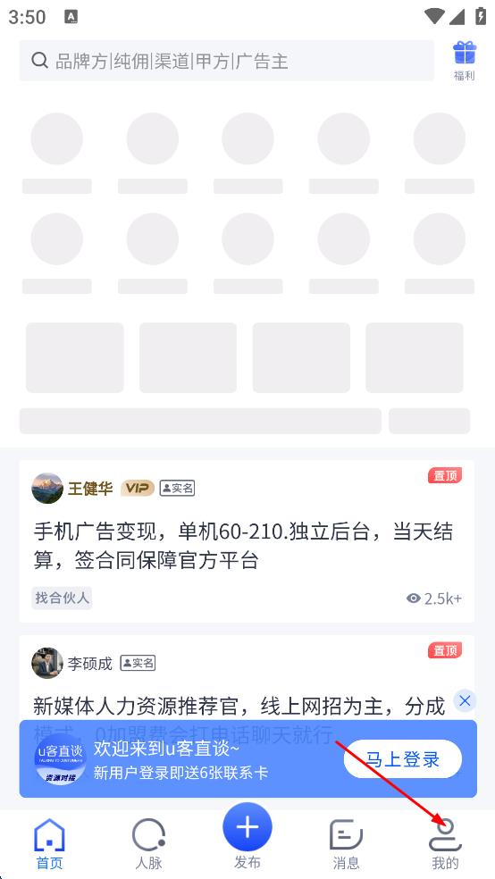 2、在U客直谈主界面,点击右下角“我的”,进入登录准备页面。
