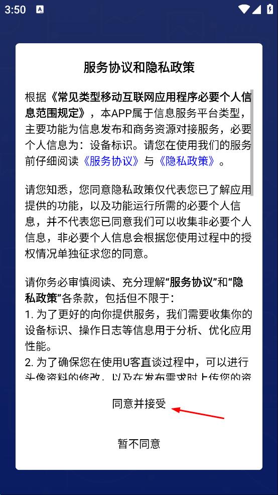 1、打开U客直谈,在弹出的服务协议和隐私政策提示框中,认真阅读相关内容后,点击“同意并接受”,进入U客直谈主界面。