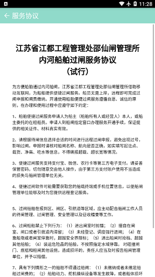4、登录后船名即与手机绑定,下次打开软件将自动登录。更换新手机后,凭识别号、注册密码重新登录。请妥善保管注册信息、支付账户密码等,勿随意交由他人操作,由此带来的损失,与船闸管理单位无关。