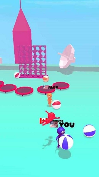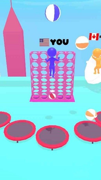 游戏中,玩家需要搜集与自己颜色一样的篮球,然后通过蹦床跳起,再将球投进篮筐, 要让同一篮筐中自己的篮球三个相连才能获得胜利。