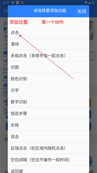2、在弹出的请选择要添加功能菜单中,选择点击等所需动作。