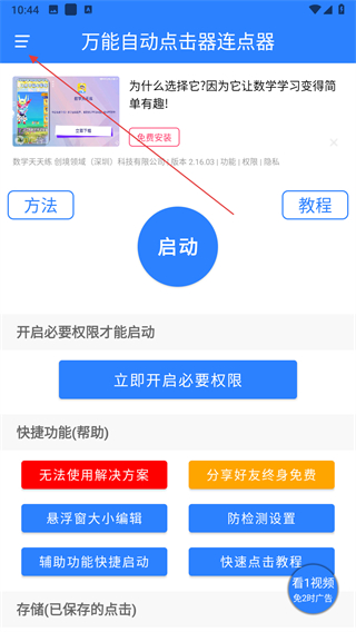 1、打开万能自动点击器连点器,点击三条横线菜单。