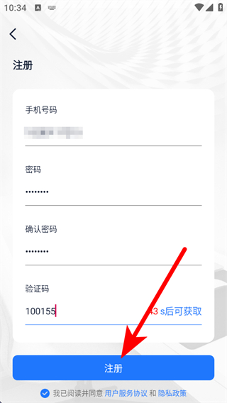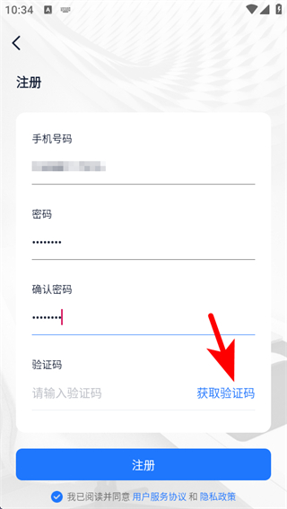 2、填写手机号、密码等信息后点击获取验证码,触发短信验证码发送。