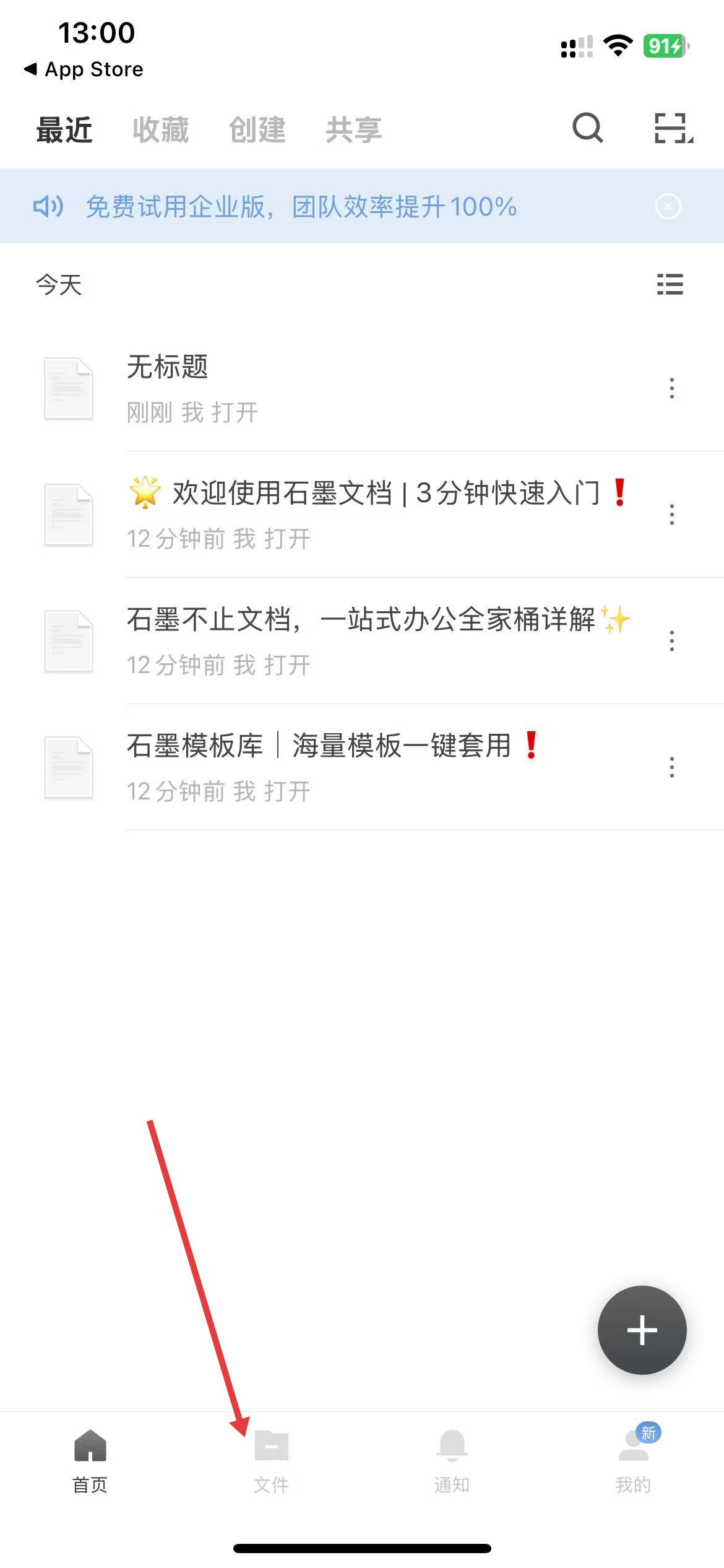 1、打开石墨文档APP,点击底部导航栏中的文件选项。