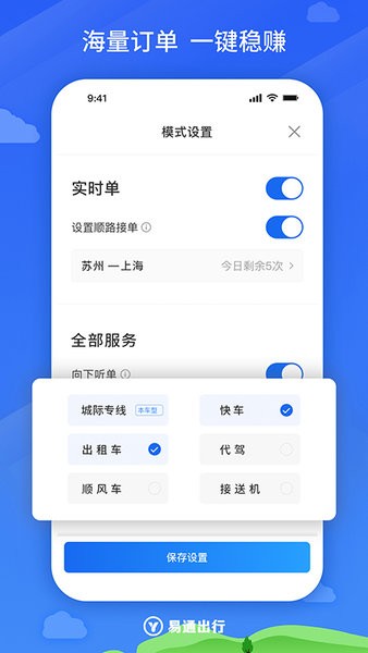 易通出行司机端是很不错的接单平台,司机朋友通过审核入驻之后就能随时随地在线抢单,每天大量订单更新,可以自行设置接单类别,包括出租车、快车、代驾、顺风车等等,为用户提供多种增加收入的方式,每日订单收入到账很快哦!