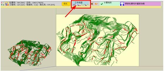 3、图中会生成一个顶视图 同时所有的等高线变成绿色备选状态 并且加入一个浅色背景衬托