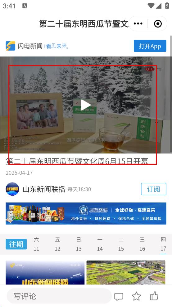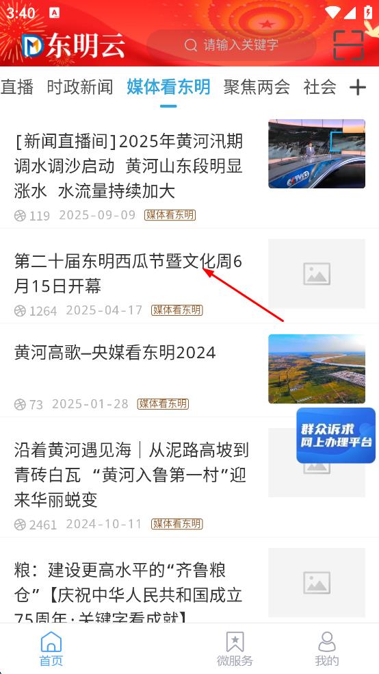 3、在媒体看东明相关页面点击第二十届东明西瓜节暨文化周6月15日开幕新闻标题。