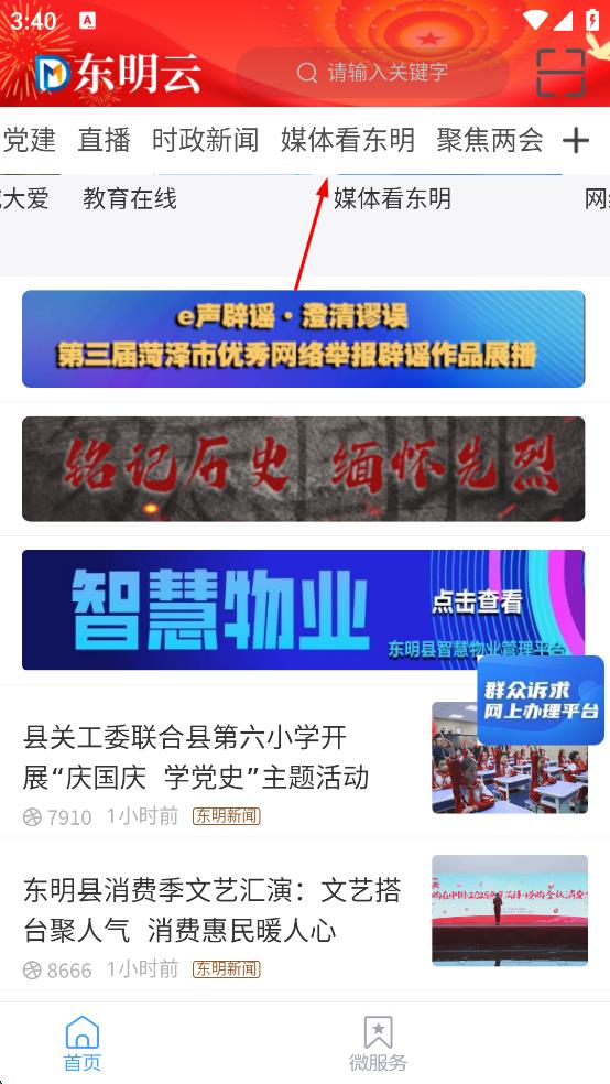 2、进入首页,点击媒体看东明选项,进入媒体看东明相关页面。