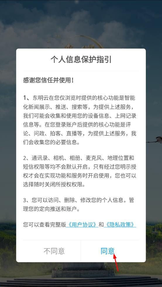 1、打开东明云App,出现个人信息保护指引弹窗,阅读后点击同意按钮。