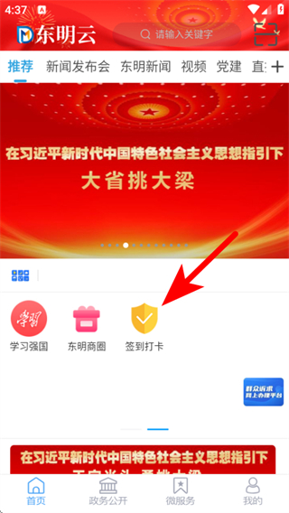 1、打开东明云app,在首页点击签到打卡,进入签到打卡页面。