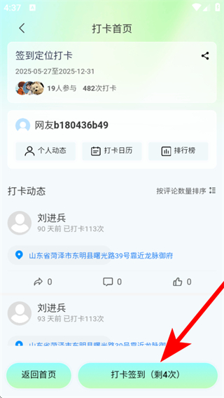 3、在打卡的首页,需要点击打卡签到剩4次按钮,进入打卡页面。