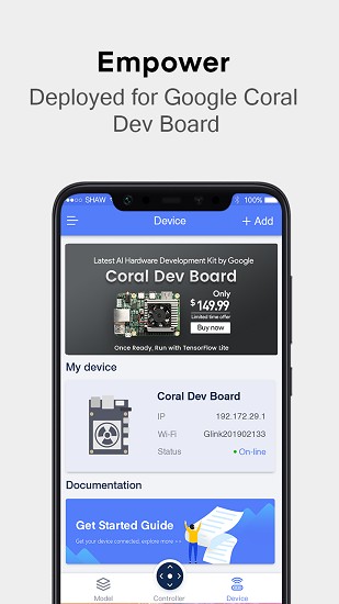 「Model Play」可完美搭载 Coral 开发板,通过手机便能预览模型的运行过程,实施启停指令。即便是 AI 初级开发者,在入门手册的指导下,预先下载 Server,就可以轻松运行模型。操作起来快速、简单、方便。