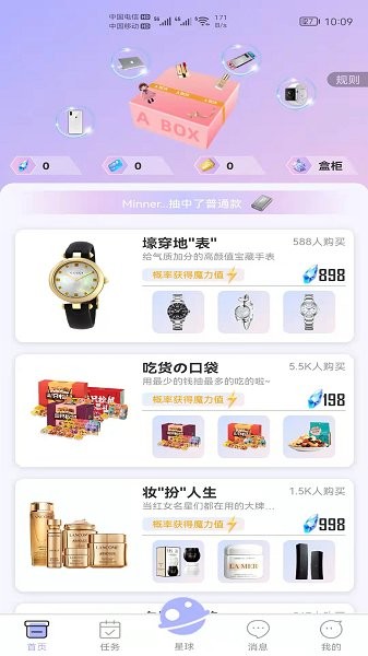 一个盒子app海量盲盒等你来抽选,采用大家所熟悉的抽奖玩法,平台提供了不同品类的盲盒,包含了服饰、饮食、电子产品等产品,多种盲盒套餐可供选择。虽然盲盒好玩,但用户也需要根据自身情况来体验哦,适当“欧气”更欢乐!