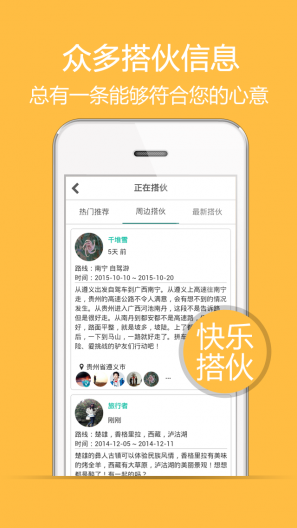 4.最流行的搭伙软件,众多搭伙消息满足您的搭伙需求,景区、路线让您随心所欲地选择。