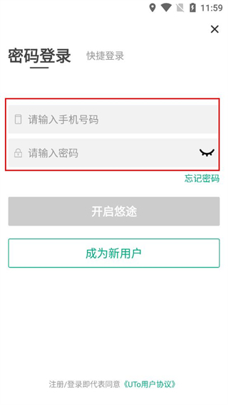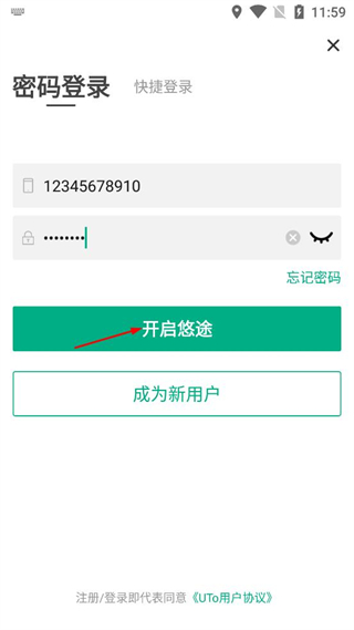 4、确认手机号码与密码填写正确后,点击页面中的开启悠途按钮完成登录。