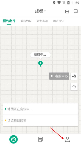 1、打开成都出行软件,进入主界面后,点击底部的个人中心选项,进入对应页面。