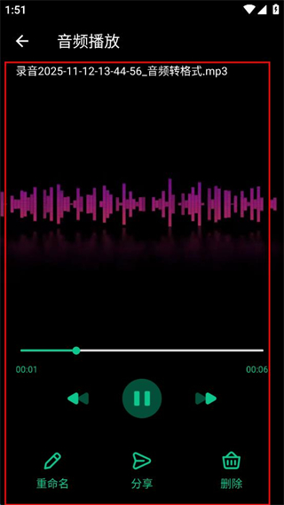 4、转换完成后,进入音频播放界面,可对转换后的音频进行播放、重命名、分享等操作。