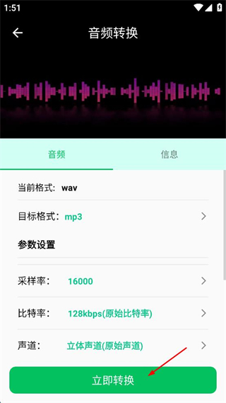 3、在音频转换界面确认目标格式及参数设置,点击“立即转换”。