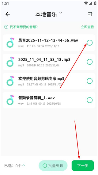 2、在本地音乐选择界面选择需要转换的音频文件,点击“下一步”。