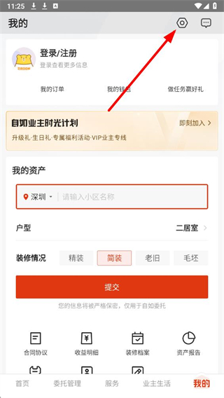 1、打开自如业主app,在我的页面,找到右上角的设置图标并点击,进入设置页面。