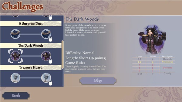 女王下令,击败怪物的人将获得半个王国的奖励。在樵夫、天鹅、狐狸和君主的帮助下,您将收集宝藏以获得女巫的信任。这些角色出现在改变游戏玩法的特殊卡片上,可以帮助您取得胜利。