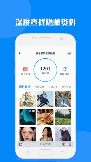 聊天记录读取助手软件,是一款智能化的工具软件,主要针对微信、qq聊天工具的聊天记录数据检索、查询、删除和管理,支持对检索图片、视频、文件、音频的保存、删除和分享,一键智能检索,并且内置了手机管家,可轻松查询、管理手机安装软件和无用apk程序,支持一键卸载,删除功能,轻松对手机进行清理,释放更多存储空间。