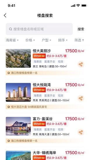 4、地铁房、学区房、精装房、现房等都有,根据类型的不同快捷查找房源。