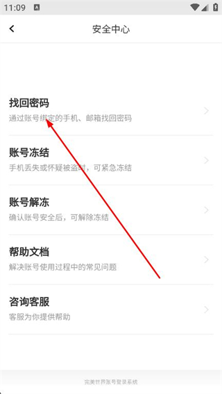 2、进入安全中心页面后,选择并点击找回密码选项。