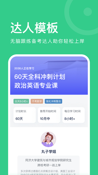 海量搜集并总结考研、四六级、雅思托福、公考等上岸学长学姐经验,制定考试计划模板,帮助你在正确的道路上越走越远。