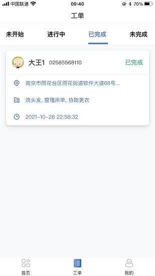 服务人员可以签入、签出工单,上门对老年人提供养老项目的相关服务