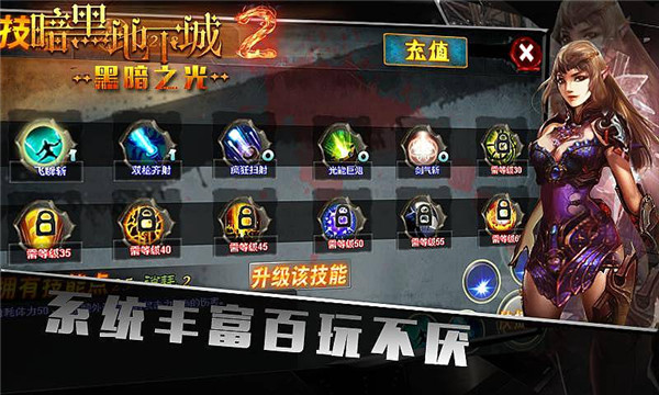 暗黑地下城2黑暗之光是一款画面绚丽的横版动作闯关游戏。游戏中,数十个小时的游戏时长,106件属性不一的装备,21个效果各异的技能,5大主城,85张副本地图,将诚意和厚道诠释的淋漓尽致,是一款十分游戏的战斗手游。