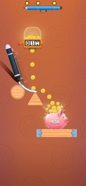 1、用自己手中的笔,在各种各样的机关下,通过画出一条线来,让硬币到小猪的存钱罐;