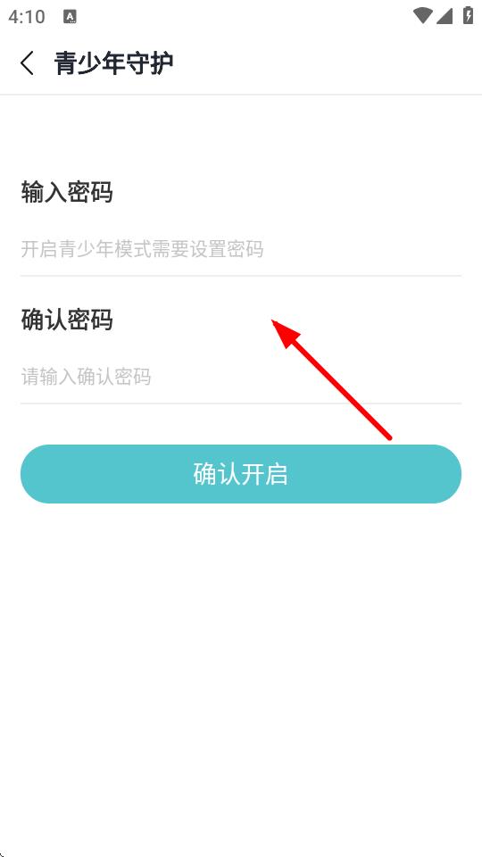 4、在青少年守护页面,输入并确认密码后,点击确认开启即可打开青少年模式。