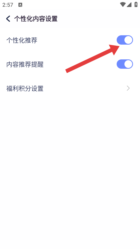 4、在个性化内容设置界面,点击个性化推荐开关按钮将其关闭,即可停止个性化推送。