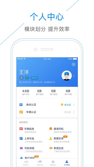 云鸟自承运司机端是一款可以在线接活的app,司机通过云鸟自承运可以参与任务报价,被选中后在运力安排中查看每天要配送的任务,在个人中心的业务明细可以查看到每天的配送运费的收入记录。司机必须先在个人中心最上面进入个人信息中完善信息参与认证才能参与报价,填写越详细被选中的概率越大!